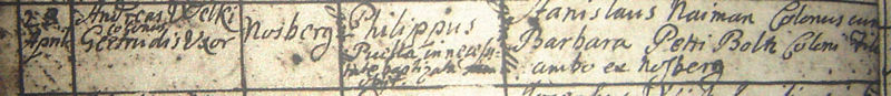 Am 11.11.1734 heiratet er in Nossberg [257] Gertrud Radig, Tochter des Bauern [514] Michael Buchholtz