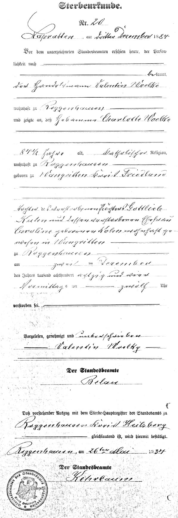 In der Sterbeurkunde wird Carolina als Hebamme CHARLOTTE, Tochter des Pächters GOTTLIEB KUHN und seiner Ehefrau CAROLINE KOHN, gewohnt in Wangritten, benannt.