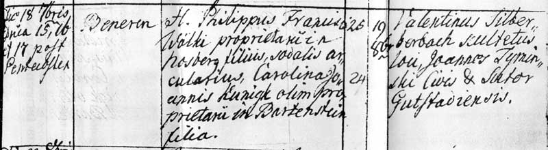 Am 19.10.1824 heiratet Philipp [33] Carolina Kuhn , sie ist lt. Traueintrag die Tochter des [66] Johann Kunigk (Kuhnki, Kuczki) † vor 1824, Eigentümer in Bartenstein.