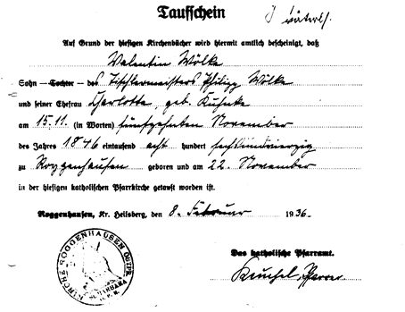 - Valentin Wölke, Taufschein 15.11.1846