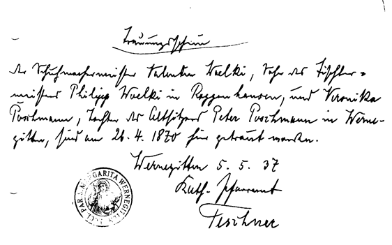 - Valentin Woelki und Veronika Poschmann, Trauungsschein 26.04.1870